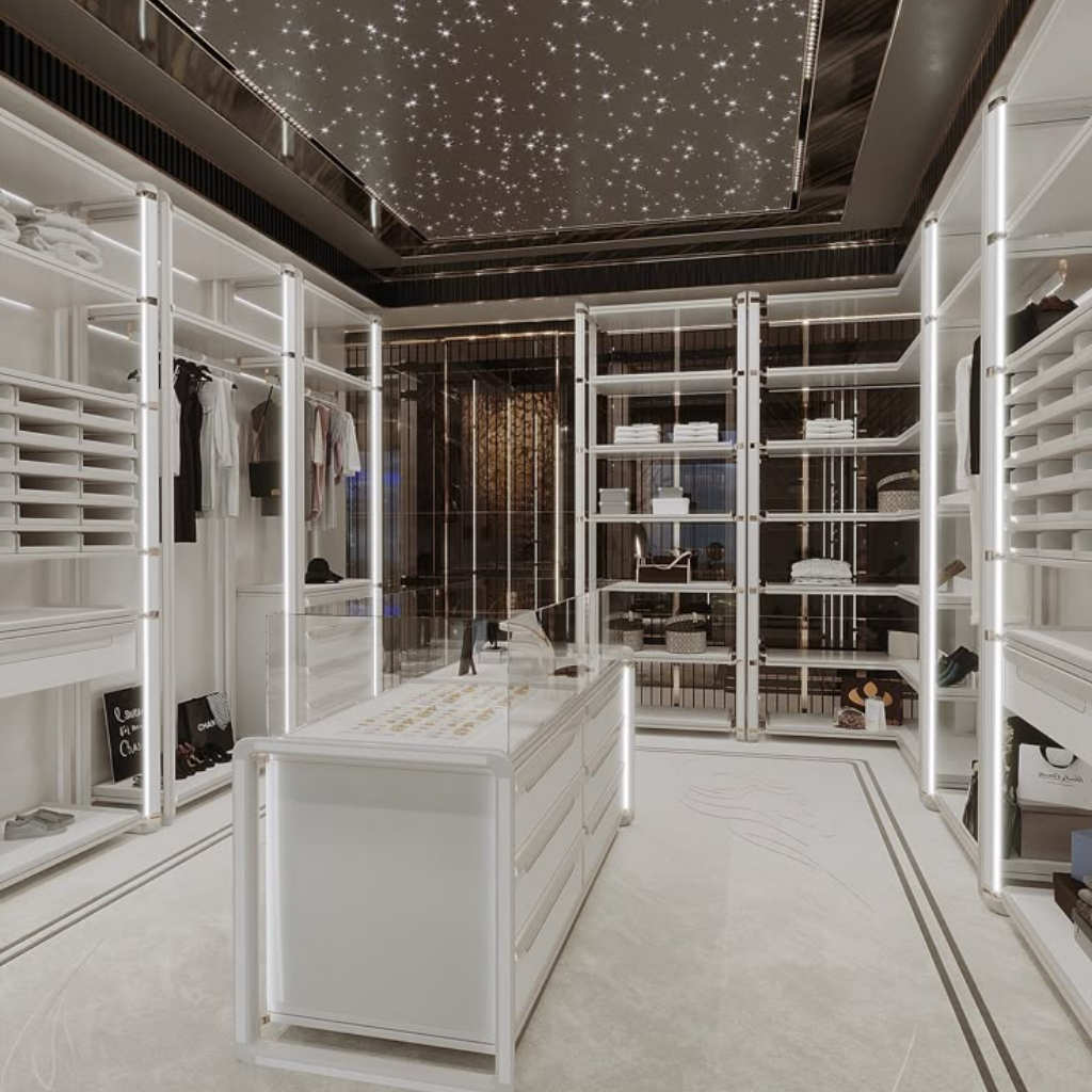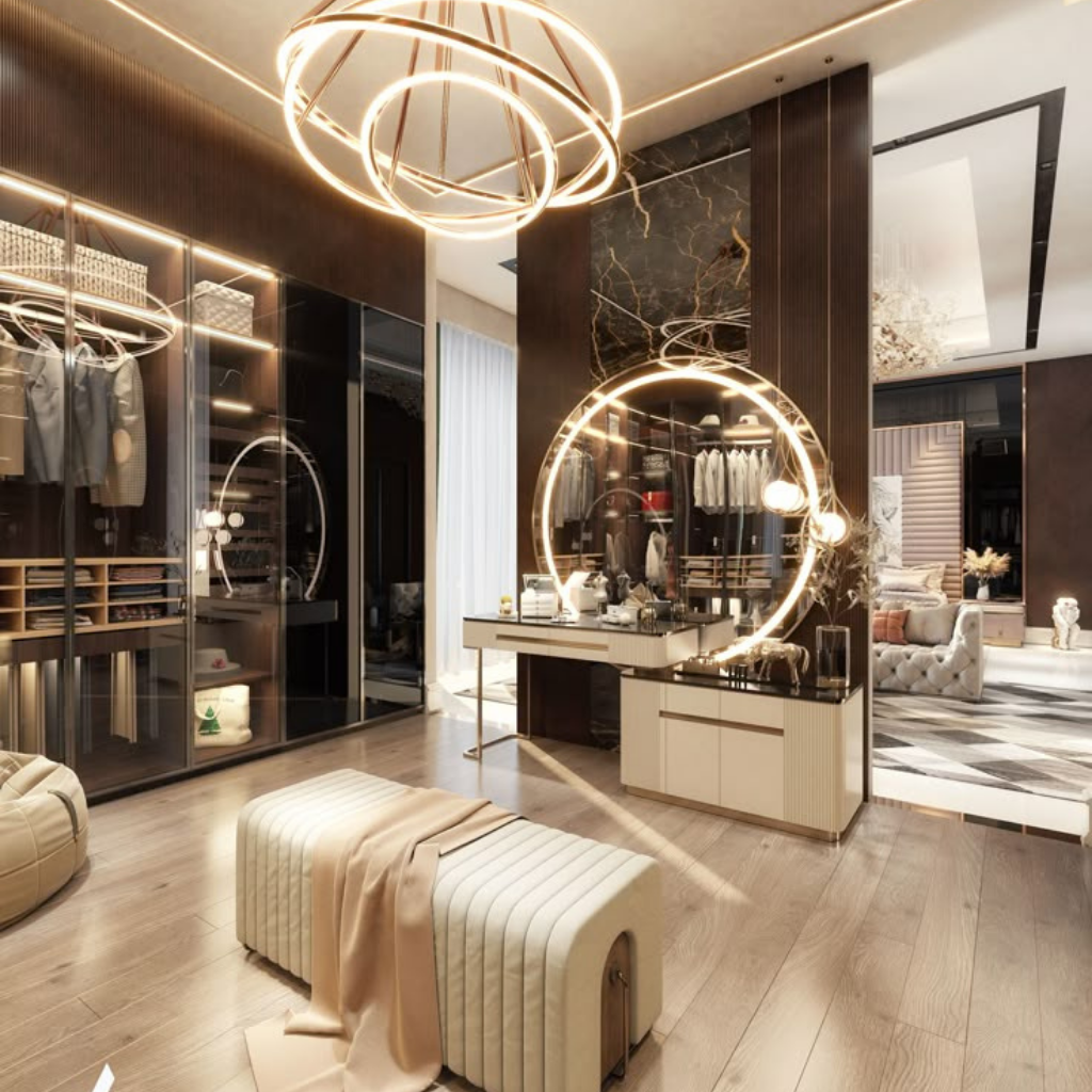 The latest trends in Dubai include a mix of modern minimalism with luxurious touches, smart storage solutions, multi-functional spaces, sustainable materials, and bold, statement-making designs. Neutral tones with natural elements such as wood, stone, and metal are popular.